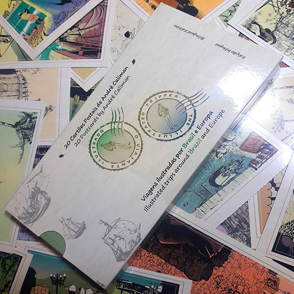 Ilustrações de viagem de André Caliman. A caixa contém dois livros. Um de viagens pelo Brasil e outro de viagens pela Europa.